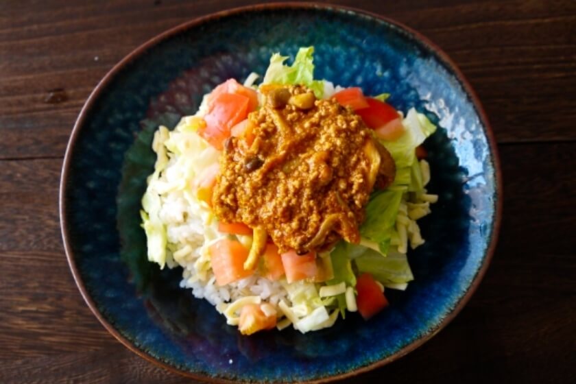 - As a result of the American presence in Okinawa, taco rice is popular as a casual dish. It is usually found as a bowl of spiced ground beef, cheese, and salsa served on top of white rice.